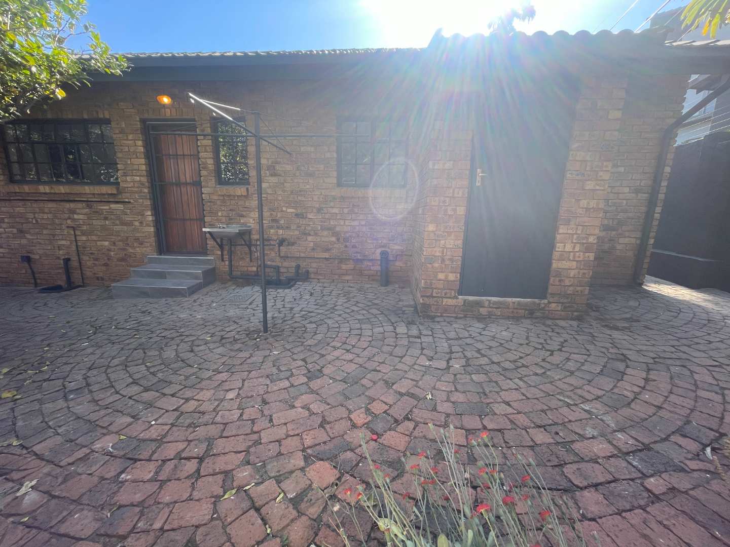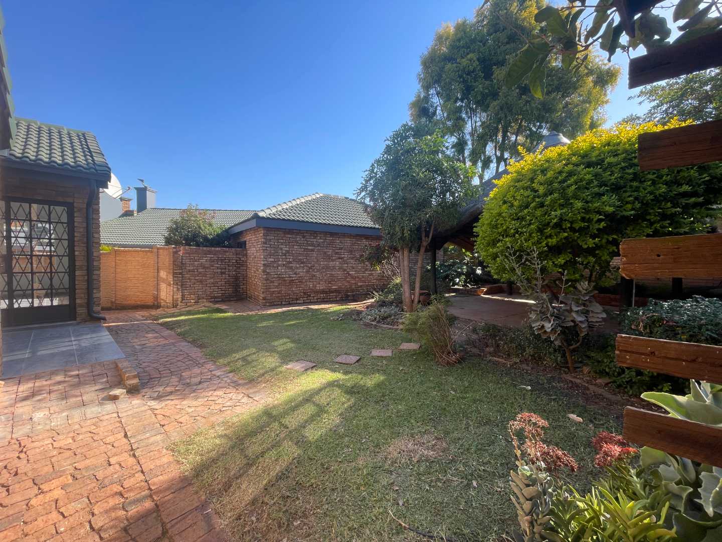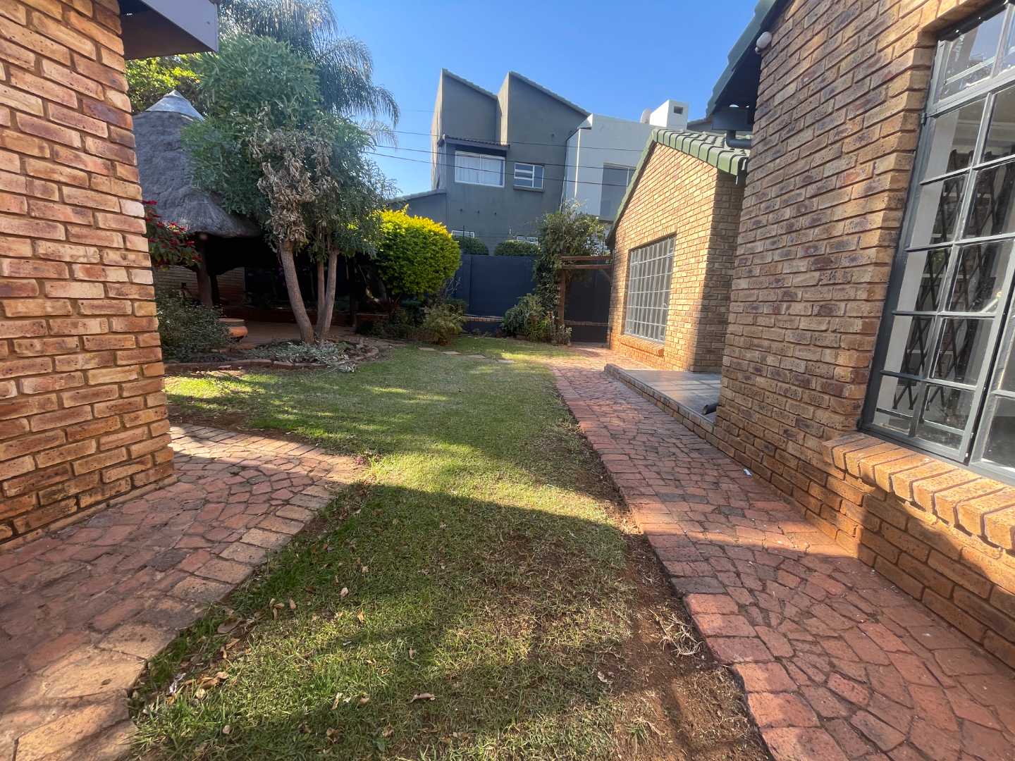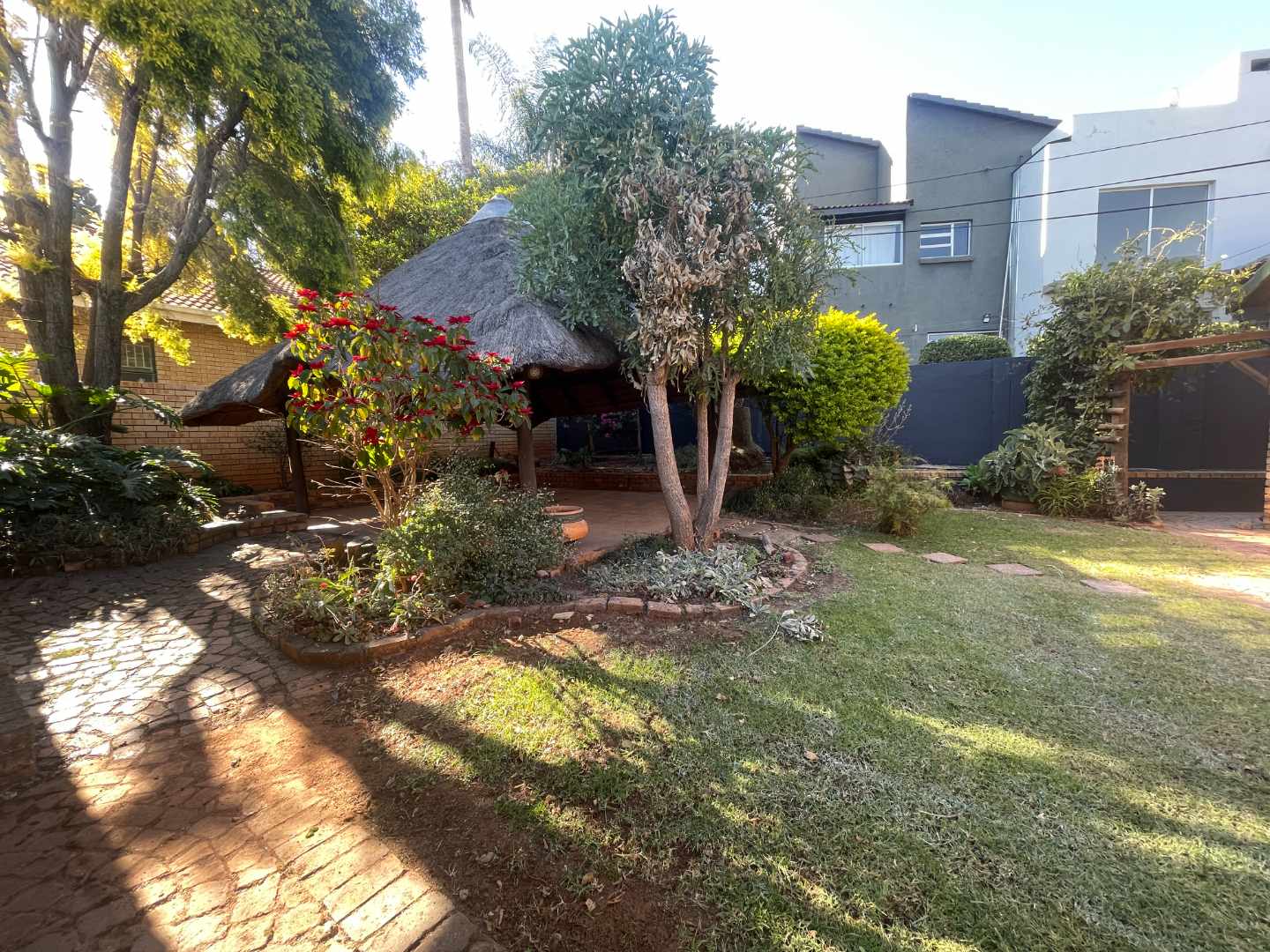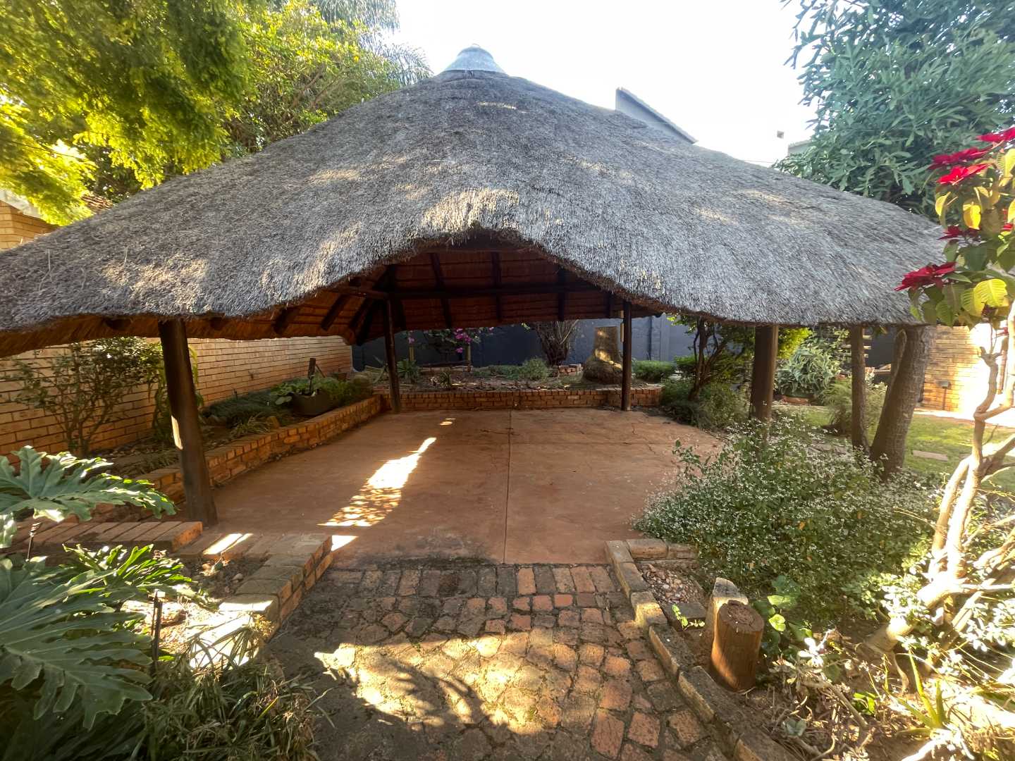 The living area is a sunlit retreat, designed to welcome natural light and create a warm, inviting atmosphere. This space seamlessly flows onto a small patio, perfect for morning coffees or evening relaxation, and extends to a charming back garden. The garden features a delightful thatched lapa, ideal for outdoor entertaining or simply unwinding in the peaceful surroundings.