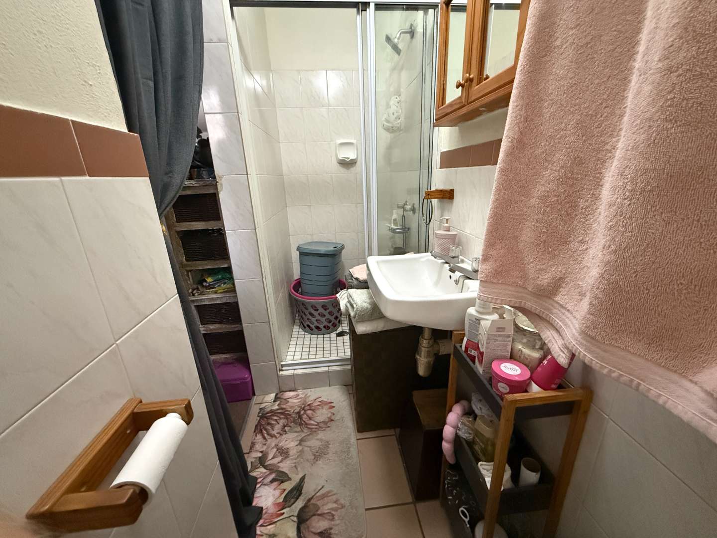 The layout effortlessly flows into a spacious bedroom, complete with built-in cupboards to accommodate all your storage needs. The bathroom is elegantly designed, featuring a shower, toilet, and basin, combining functionality with style for your daily routine.