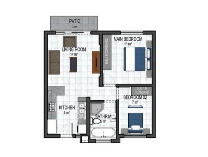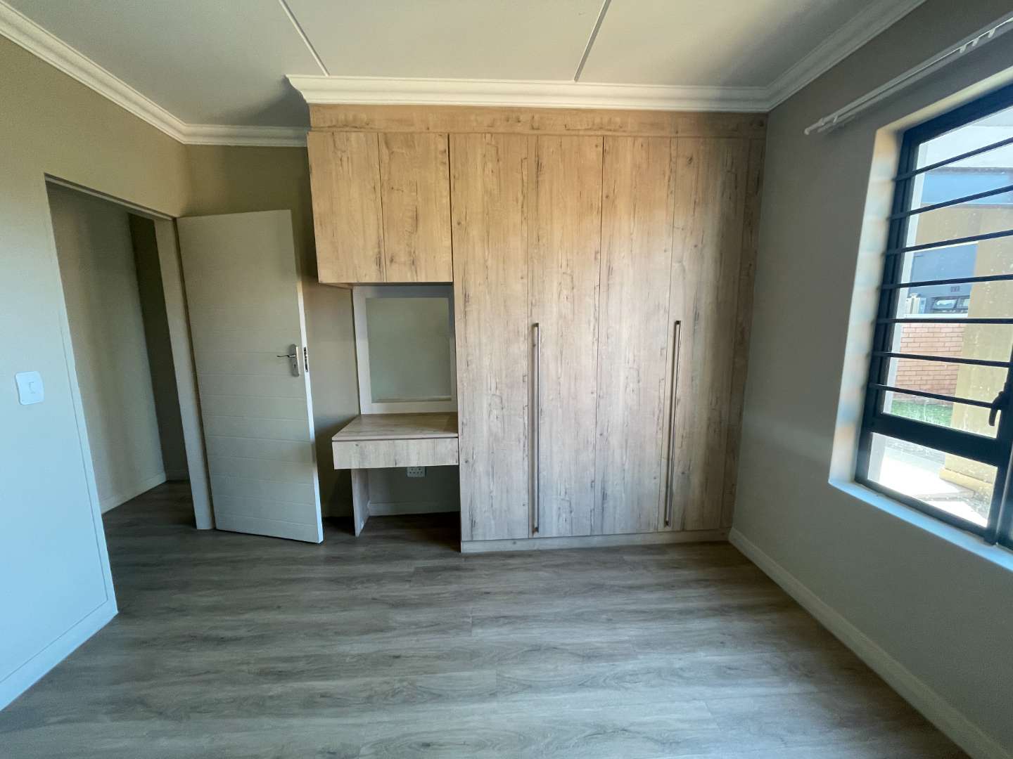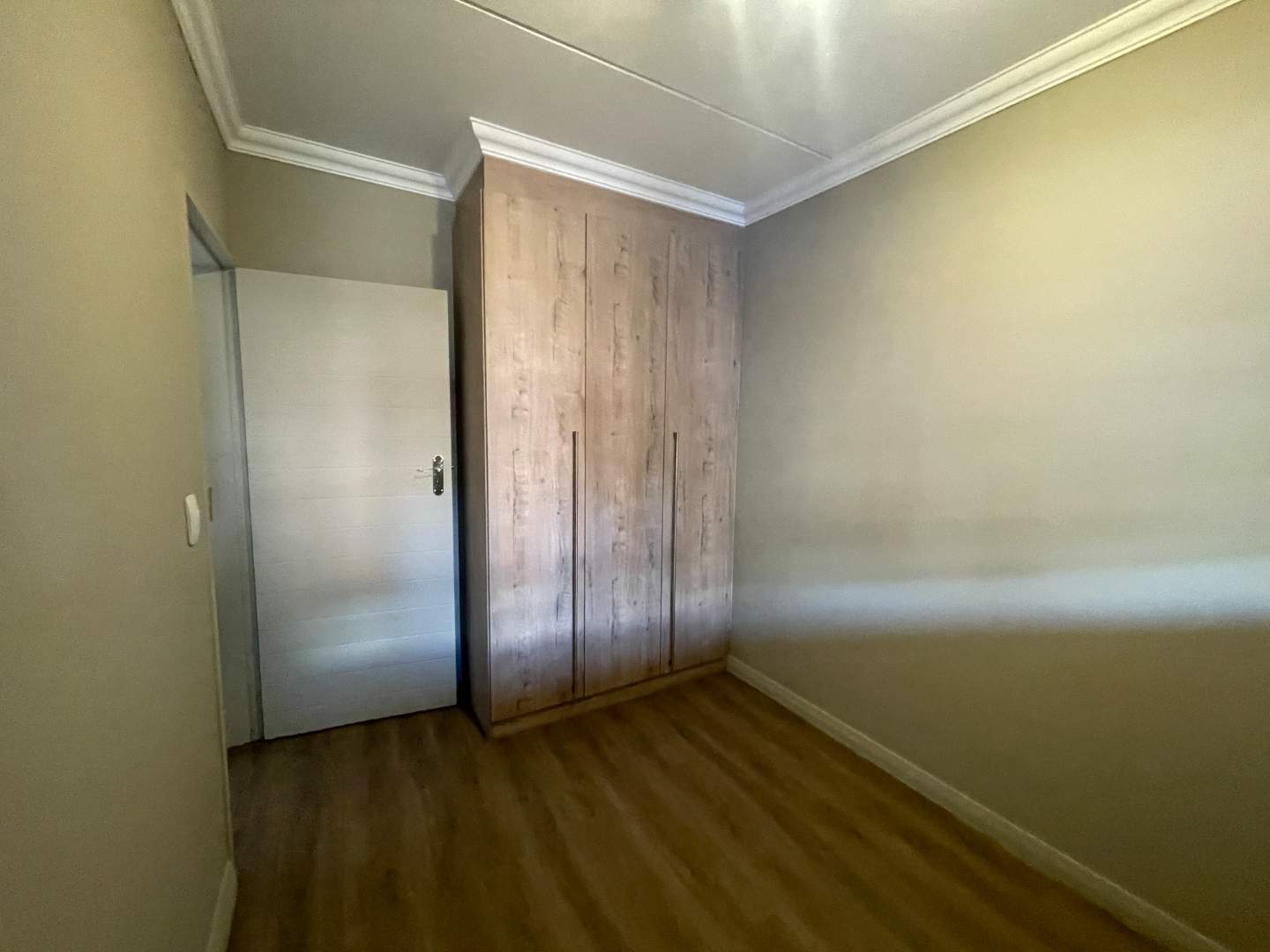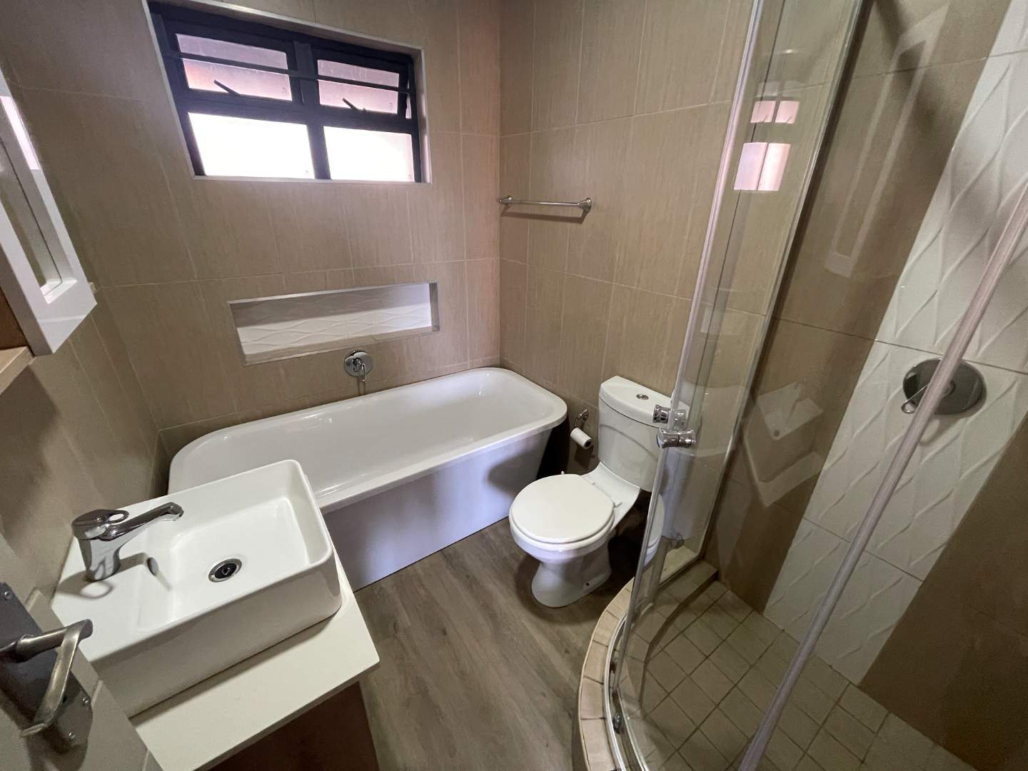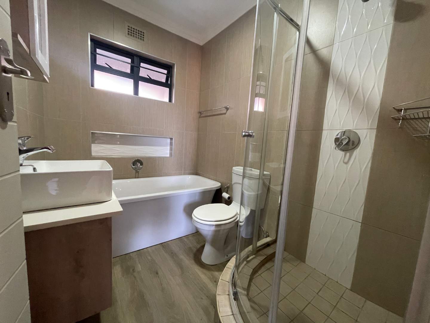 This inviting ground floor unit boasts two spacious bedrooms, each featuring laminated floors and built-in cupboards, providing ample storage and a comfortable living space. The well-appointed bathroom includes a bath, shower, basin, and toilet, all complemented by a gas geyser for efficient water heating.