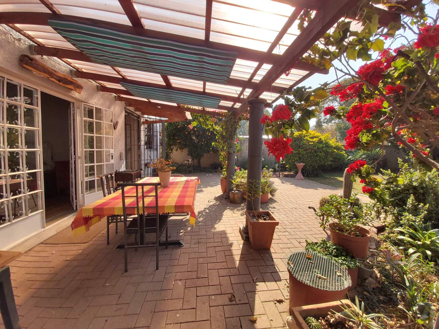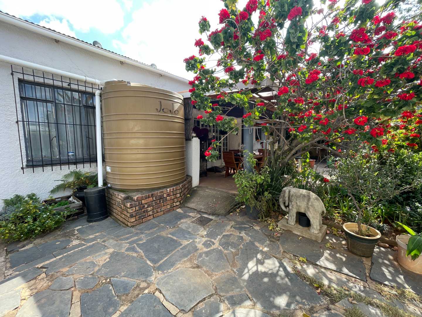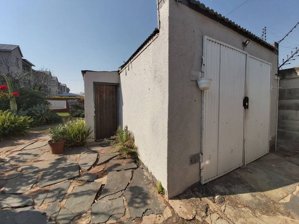 Practical features include a corrugated roof with two ventilators and a solar geyser, promoting energy efficiency. A Jojo tank is also available to collect rainwater, supporting sustainable living. The garden provides a serene outdoor space, while the single lockup garage includes a laundry area and an outside toilet for added convenience.