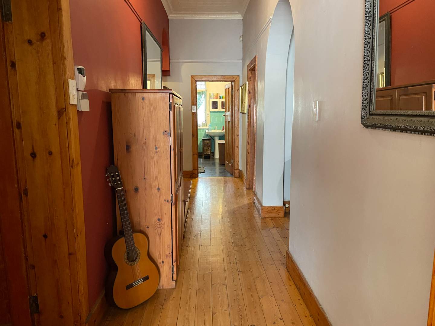 The home's oregon wooden floors and cupboard doors are complemented by stunning vintage pressed ceilings, exuding a sense of timeless elegance. Outside, the patio is adorned with a bright red blooming poinsettia, creating a picturesque setting for outdoor relaxation or entertaining.